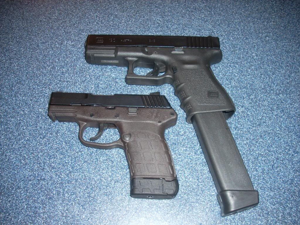 Here they both are with their extended mags.  One extended Glock mag has more firepower then 4 extended Kel-Tec mags, lol.