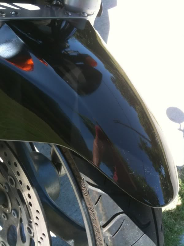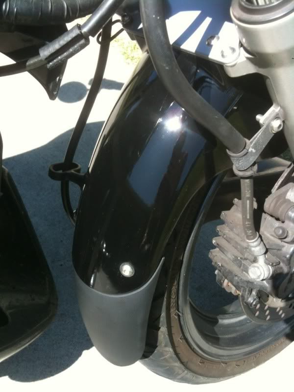 So I have been busy getting my new to me front mud guard (thanks, adidasguy) to replace the one one of the PO's melted, complete with new paint and new mud flap. I wanted to paint it gloss black to match the rest of the bike, since the mudguard was a metallic dark charcoal color when