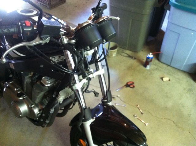 So I got everything painted black, and it is all looking really good. The scratches on the upper bar clamps show through a little bit, but all in all it was a success. The headlight brackets look really good, 1000x better than nasty pitted and rusted chrome. Everything is mounted back on there, except for the handlebars in their final position since I dropped one of the upper clamps and had to spray some more paint on it.