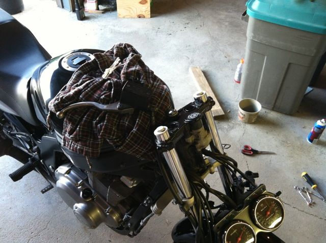 And here is how my bike sits at the end of the day. My lower bar clamp had some nasty streaks and grime on it, so I took it off to repaint it since I was already repainting the headlight bracket.