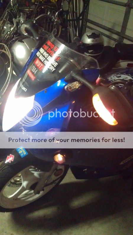 Okay so basically, I am in the process of selling my 2005 GS500F and upgrading to a 2012 Kawasaki Ninja ZX6-R. The thing is, the previous owner dropped it a couple times so there are some fairing cracks and what-not and one of the turn signal stems had broken in half and was held together by gorilla tape. Yesterday, under the influence of alcohol, I decided to be brave and fix the turn signals and make them look better. I figured that i couldn't possibly make it any worse than it is  :thumb:. Thus, my flush mount project began.