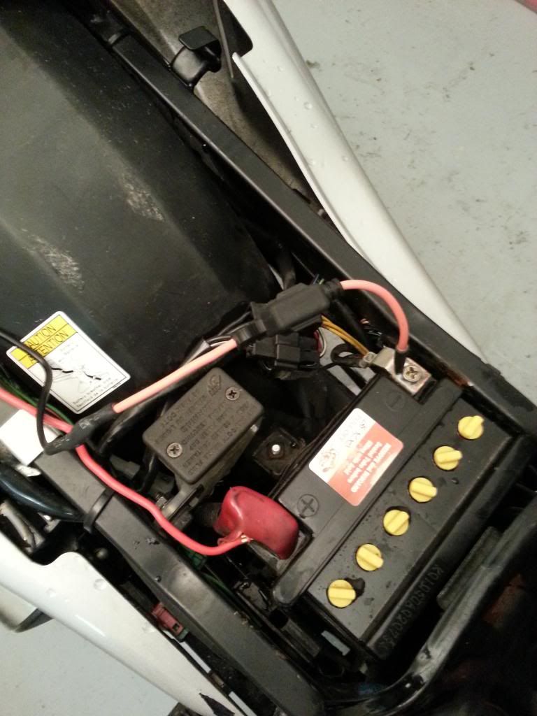 I just installed an accessory power socket into my 2008 GS500F. I decided to attach it right to the battery so I could keep my GPS running even when the bike was turned off. I'm not worried about forgetting it and draining the battery.
