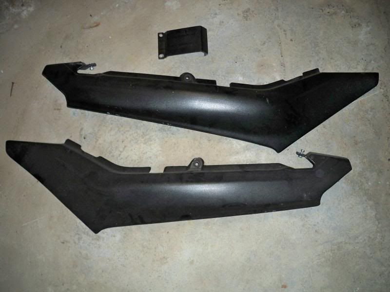 Selling my used plastics since they won't be needed anymore. Outside is in great shape, the one panel has a small crack that was patched. All the mounting points are there, and the elusive center piece is included. They have a textured black paint with a ghosted stripe, but could be sanded and repainted.