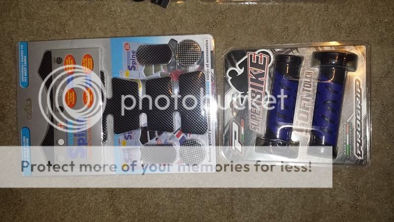 A spare pair of ProGrip 719 gel grips (Blue) and Oxford Carbon fibre tank protector. Even if you don't like blue I highly recommend the Progrip gel grips in a colour you like, they make a big difference if felt vibration  :thumb: