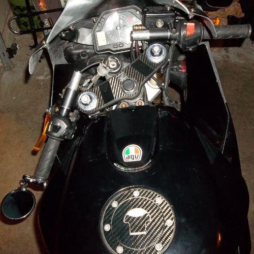 Some other mods I installed are Skurr carbon fiber gas cap cover and triple tree cover. I also have an HRC real carbon fiber tank pad coming in the mail for the new fairings. Heres some pictures: