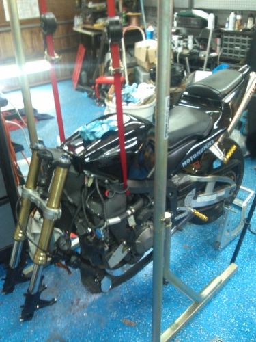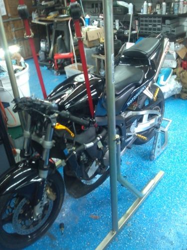 Removed the fairings and hooked it up to the overhead hoist with some ratchet straps