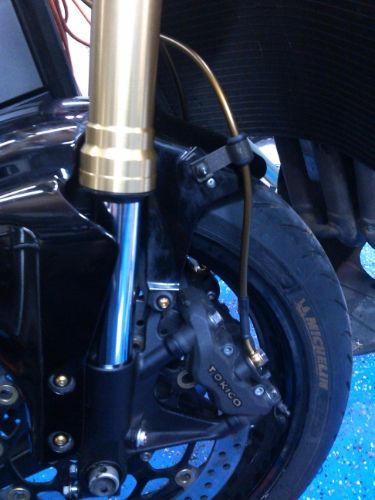 I really love the look of the inverted forks, and havent seen the improvement in braking with the radial mounted calipers, probably cause the pads still need to wear to the rotors. So with this fork swap also came new stainless gold core moto brake lines, awesome! And new woodcraft clip ons.