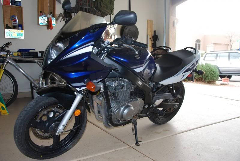 Yep, I bought this 2006 GS500F with 5000ish miles on it for $500 bucks.  The bike had nasty gunked up rusty carbs and cracked intake boots and dry rotted hosed and vacuum lines.  One of the fairings was cracked, a Jardine exhuast was nastily welded on, the bar end weights were all beat up.  Looks like it had been dropped in the driveway a few times.  It also seemed to have sat out in a driveway in the Arizona sun for a long time.   Overall just a neglected bike.  Rebuilt the carbs and removed the PAIR system and got it running pretty well.  I figured this was a score for $500 bucks.