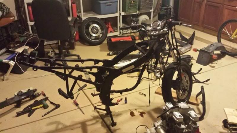 I was going to go for a tracker/scramblerish look but now I think I am going full blown Mad Max.  I am going to check the valves while the motor is out and then paint the motor.  I have an R6 shock and spring, .75 straight rate front springs (I am 165lbs with gear) I need to make a seat pan and relocate the stock seat release flush with the top of the frame.  I also have a new tail light, foot pegs, K&N Lunchbox, some paint for the gun.  I am going to do all the bearings on the bike while it is apart too.  Other things to figure out will be the fenders and if I am going to keep the bike two up or just make it a solo.