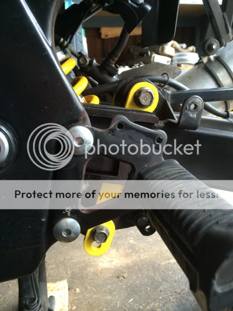 The yellow SV650 shock is not, and will never be, a direct bolt on. Even if you drill the lower mounting hole higher, the shock will either hang up on the linkage, or rub the swingarm, or both. These are serious problems.