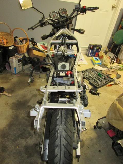 Pushed it back inside to dry overnight, didn't want to risk scratching the paint by installing the wheel. Through the tank, seat and tail back on just for fun.