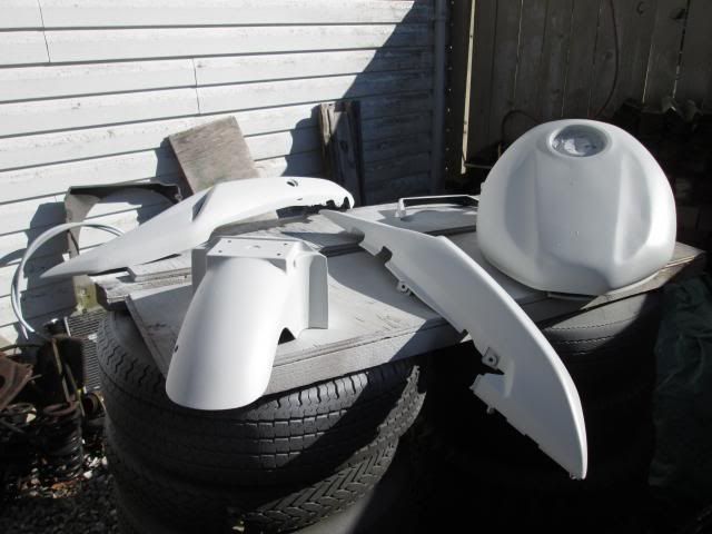 I actually don't mind the matte white, maybe it'll stay this way for a while. Tomorrow the exhaust goes on. The pegs I ordered on ebay were supposed to be for GSXR rear pegs but I think they sent me front pegs. Have a lot of grinding to do to make them fit. If there's time, the body panels will get a guide coat and sanded for paint. Paint probably won't happen until Wednesday so stay tuned.