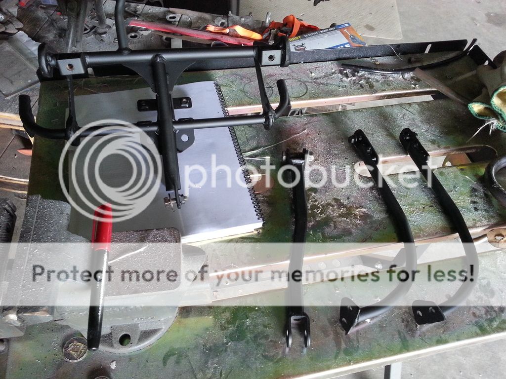 Sorry about the metal tubing laying around - I'll get to that later on.... and some of the stuff I powder coated: headlight / fairing mount, rear brake arm, and lower fairing mounts: