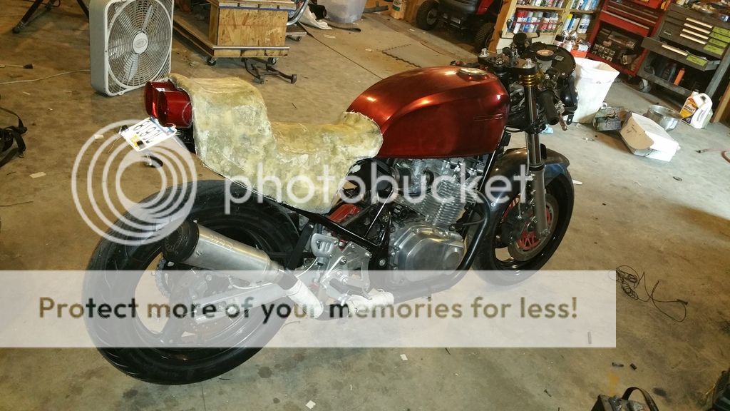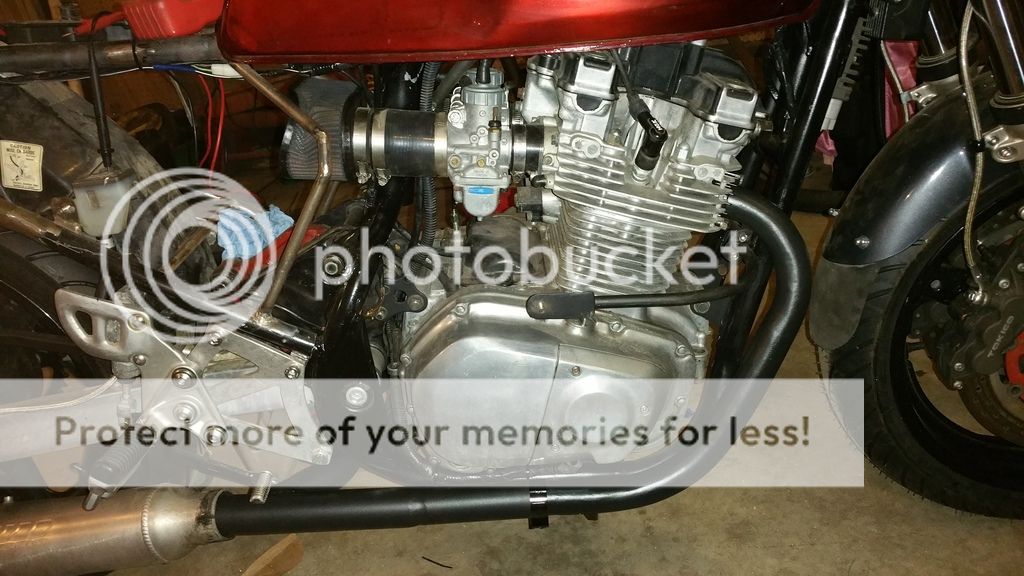 So let's see.... finished powder coating the exhaust, and added a little bit of exhaust wrap (only near the brake lever to prevent boot burning). Took the seat frame completely off, sandblasted, and painted it for now. It will get a proper powder coated finish once everything is done, but for now I just need to prevent rust. And I made a gasket for the taillight lens so water can't get in there. If you look real close around the carbs, there's a black hose connected to the cylinder head. That's a GR650 thing.... originally there is a hose between the cylinder head and carbs that sucks a small amount of filtered air into the intake. Because the air comes in at an angle, it "swirls" the intake mixture for some type of performance gain. Since I don't have stock carbs, I would use rubber vacuum plugs to block the holes. They always get too hot and leak, so I finally got a silicone hose on ebay to do away with those rotting plugs.