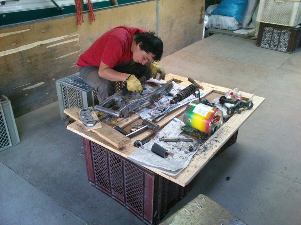 Mirror polished swingarm, cuted and reforced to avoid friction with the shock spring