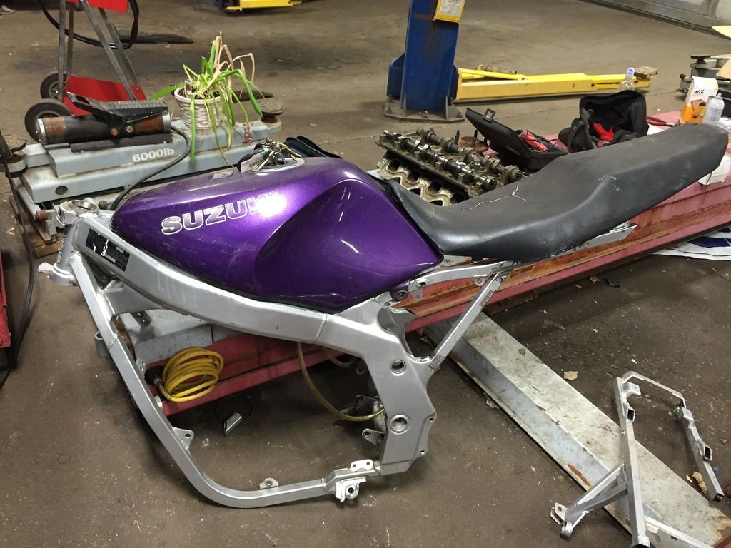 I rode it like that last summer, but I eventually got sick of the purple. There were a bunch of rust spots on the top of the tank also. So I decided to tear it down and start chopping things up...