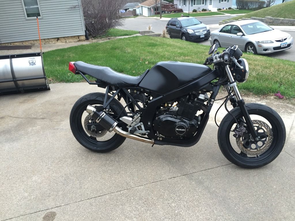 Superbike bars, '04 GSXR headlight & cowl, DRZ signals, 1/2" fork brace, 'Busa fender, stainless exhaust & brake lines, belly pan, LED dash & brake bulbs, 140/80 rear hoop, F tail lens, SV650 shock, Bandit400 hugger, aluminum heel guards & pegs, fork preload adjusters, .75 SonicSprings, heated grips
