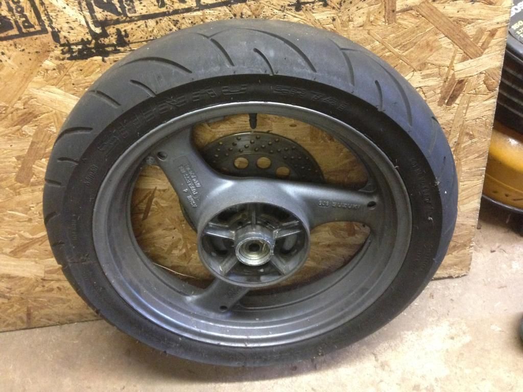 Rear wheel from a 2002 Katana 600/750.  Fits with minor modification (http://gstwins.com/gsboard/index.php?topic=25426.0) on the GS500.  Wheel has been painted gloss black and has a Bridgestone BT-023 (Sport Touring) mounted with a little over 3500 miles on it.