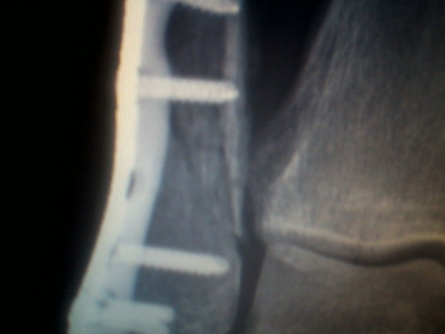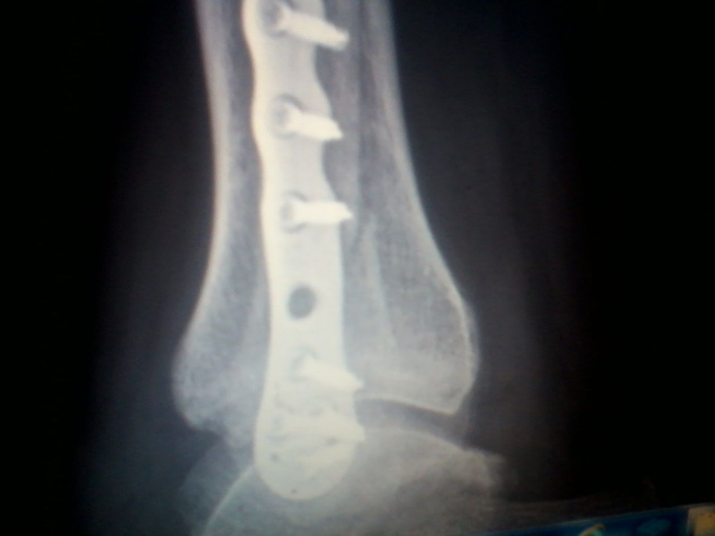 the latest xray pics youll see trhe hole in brace unhealing crack is between it and screw above it. more evident on frontal shot