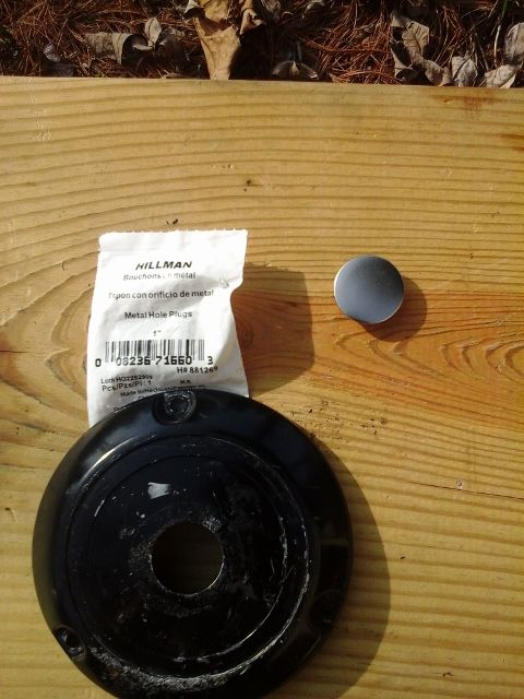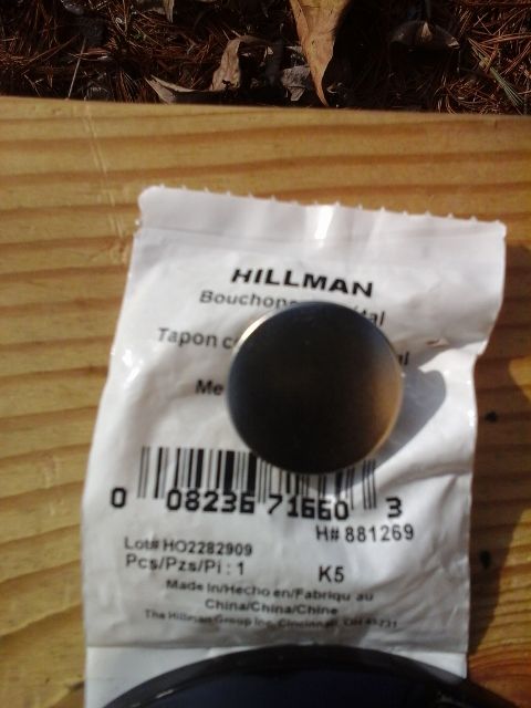 I used a 1" Metal Hole Plug - Hillman Part Number 881269  (or H# 881269).  I picked it up at Lowes and I believe Home Depot (as well as other places) sell them as well.