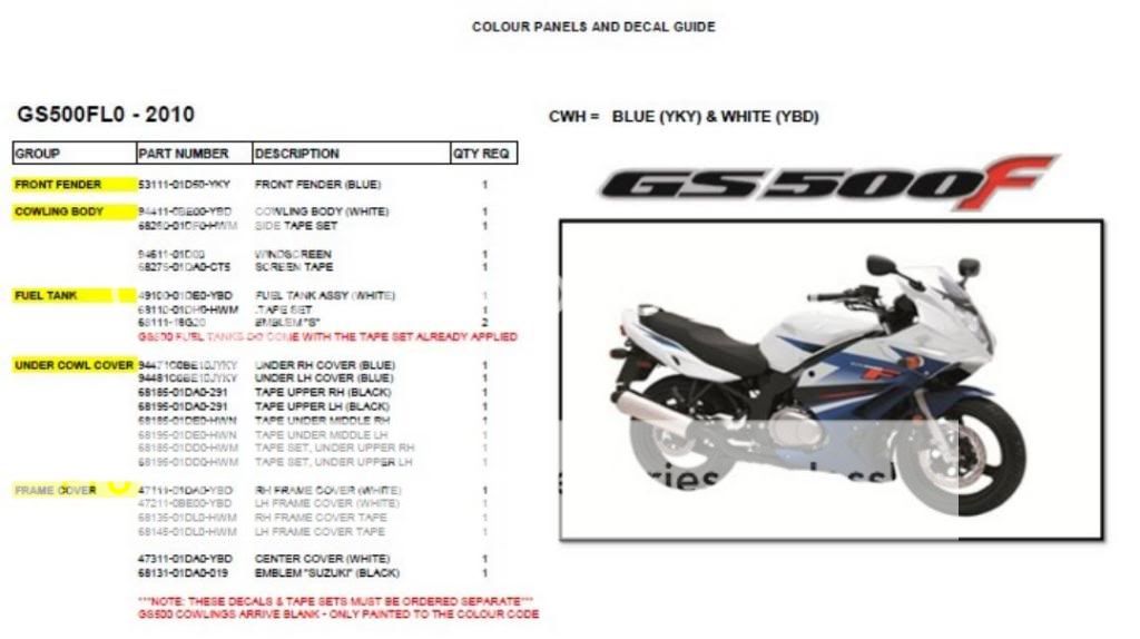 I got to the bottom of it finally and the Australian Suzuki dealer has sent me the full parts list for the 2010 (and up) GS500F (white/Blue) model which others with a same model may find useful: