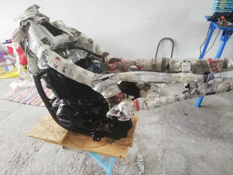 So the next step is to paint the frame, rims, fenders, fork and some other small parts black matte. And I'm going to do with the tank the same I did with side panels - to clear it to metal and cover with dozen layers of clearcoat.
