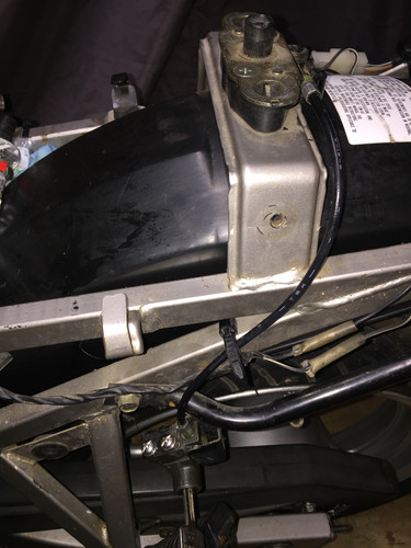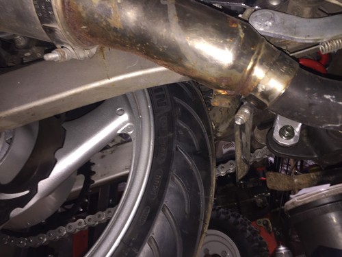 The "Cobra F1s" Muffler was poorly mounted and needed attention. There was no washer against the rubber mount. It was loose on the pipe. The exhaust clamps were positioned incorrectly and the larger clamp was hitting the swingarm.