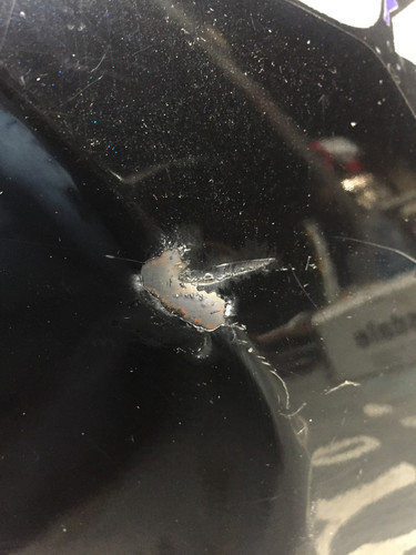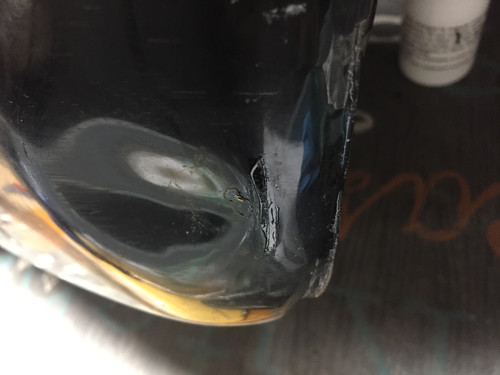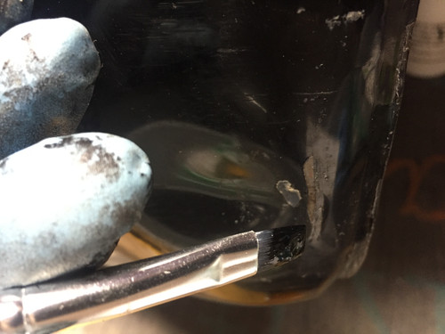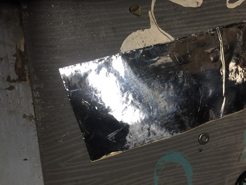 Four layers of tape, stuck/stacked, then cut into a circle and applied. One little circle on the inside.  Sprayed rattle can black. It looked good, but it's been beating around the shop for about six weeks now and it's scratched up, foil flexed and crinkled, etc... It will have to do for now.