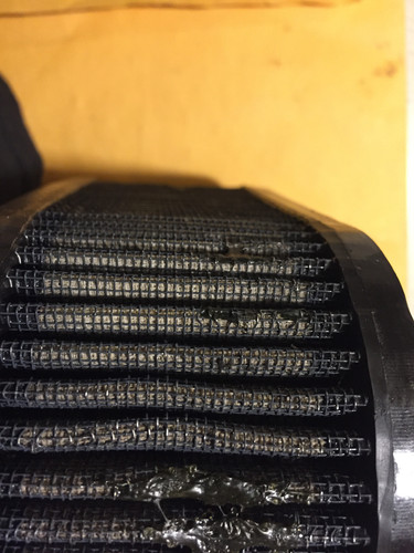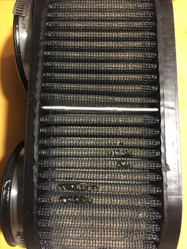 The K&N Lunchbox was filthy. After cleaning, I noticed that the wire mesh was worn in several places.  Inspection with light showed the filter media was still intact.  A little oil resistant black cement was  applied to stabilize the filter. Maybe tomorrow the the filter will get oiled and reinstalled.