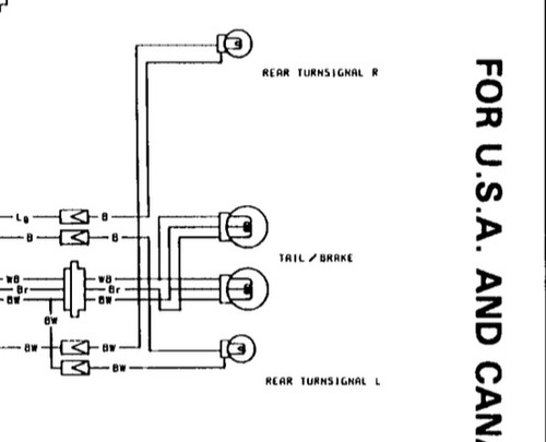 When the brake light is turned on, one bulb goes off completely, the other lights up the bright filament only.  When one bulb that does show brake light is removed, the other tail goes off.  The schematic shows wires in parallel. Suspicion of a ground problem.