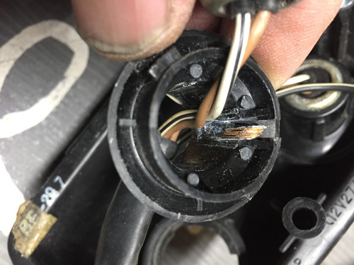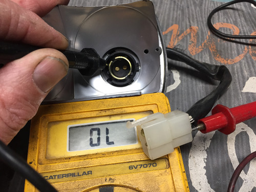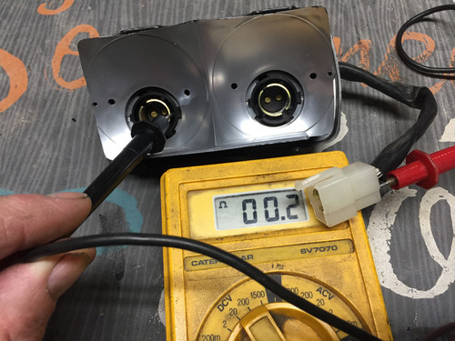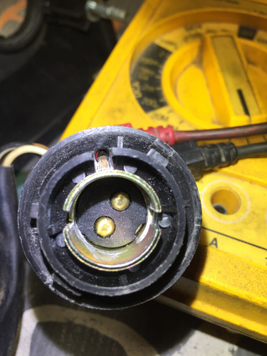 The socket removes from the taillight housing with a twist.  You can see the copper wire at the top of the socket. Probing the wire, the meter showed continuity to the plug.