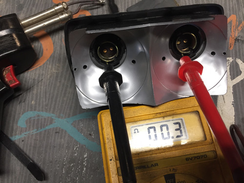 There is NO continuity between the two socket shells (ground). There is continuity between both tail light contacts and the two brake light contacts.  Also check from the plug to the sockets.