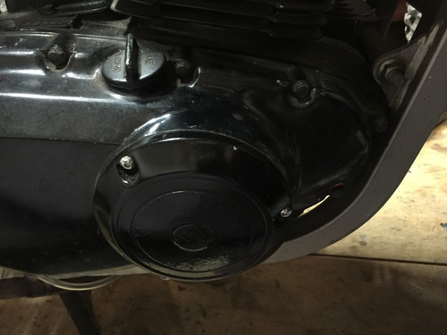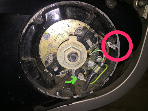 More of a worry was that one of the threaded mounting bosses is broken. (Circle in red).  Used clutch covers are plentiful and inexpensive, but was wanting to get by with this one .  FYI Note: the green arrow is pointing at the infamous oil pressure switch/sensor.