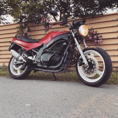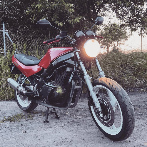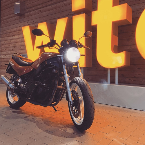 I recently acquired a GS500E for very cheap and decided it was a good base for a project bike - since I'm a millennial the scrambler aesthetic has always appealed to me so... that's the direction I decided to go with. Right now I taken care of the electrical and mechanical bits that were wrong and did some minor upgrades... First things first I swapped the forks for something stiffer, being a 6'6" 240lb guy so .9 kg/mm seemed like the right choice. I also swapped the front brake calliper for the newer ('96) ones as the old one was seized and got the EBC HH pads. I had to fix the blinker harness (the previous owner did a very poor job installing LEDs...), swapped the speedo & tach housing as the previous was bent beyond repair and I happen to like the retro look... Looking forward to getting white faces for the dials next week, I ordered them from a guy who makes them locally... well I wanted to, but the odometer stopped counting miles, so I will be swapping it tomorrow for a Chinese digital one (I tested it and got it to work just fine, just waiting for a few bits to ship). Speaking of white, the bike will be painted white... I actually started from the fender, I trimmed it to make it a bit more scrambler-y. I don't know what to do about the seat - I really like the current one (the previous owner had it professionally reupholstered), but I'll probably end up swapping it for a custom one instead of modifying it. Well, here are some photos: