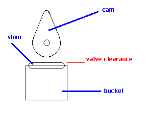 The space between the cam and the follower is controlled by a shim positioned in between them (see figure).