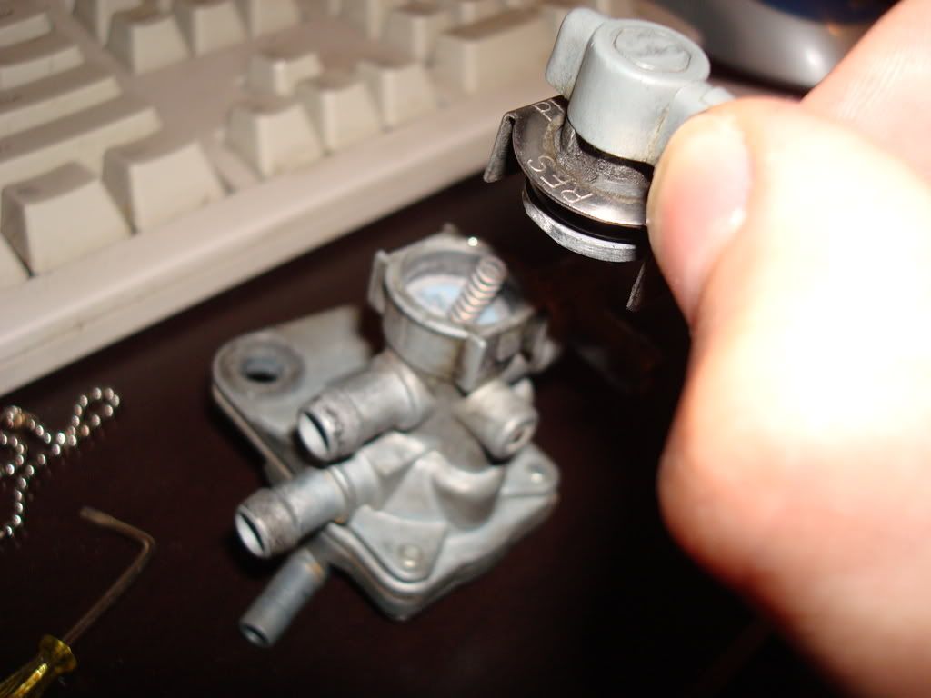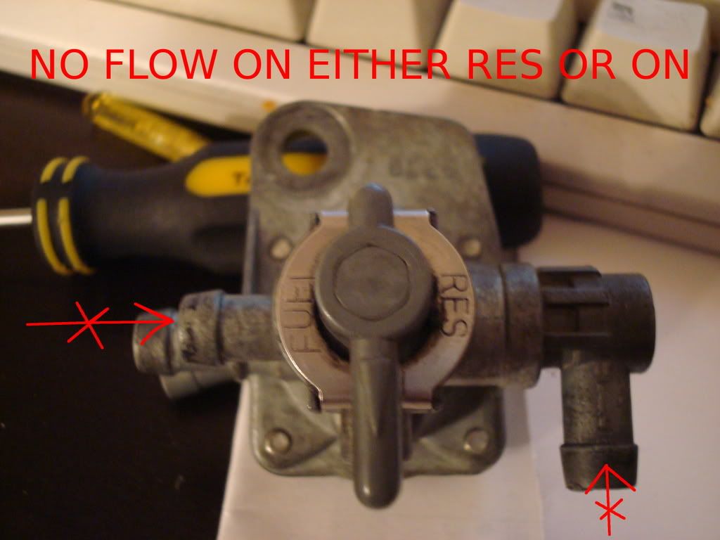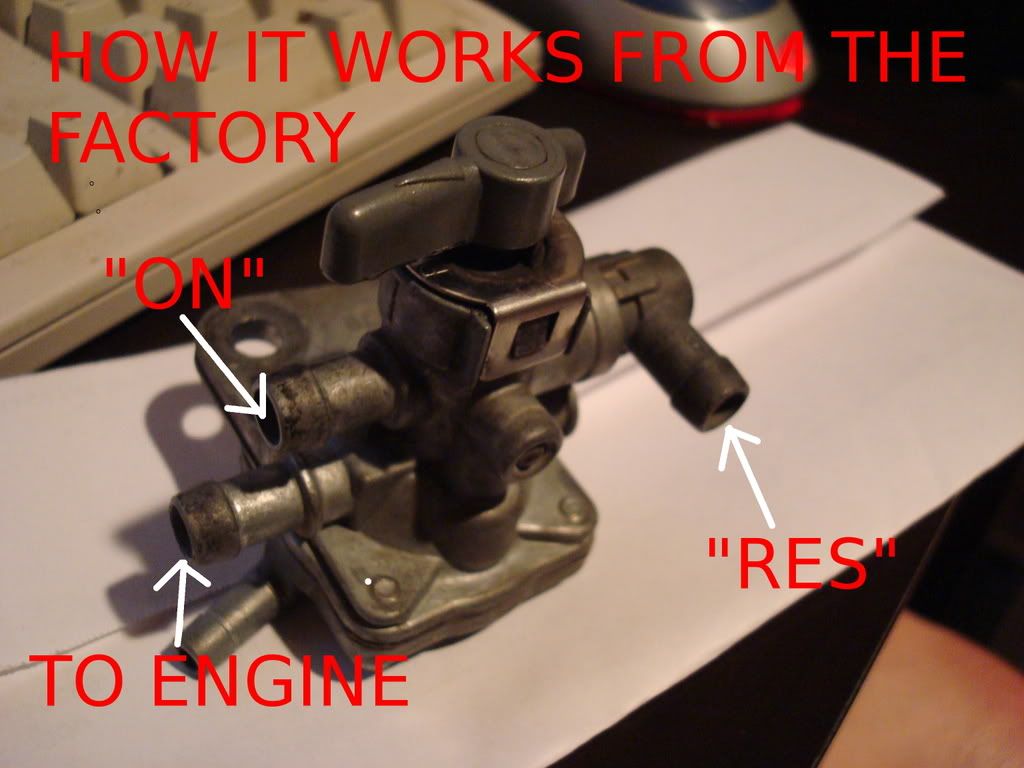 1. First lets define how the petcock works before the mod. Putting the selector on "ON" allows fuel to flow from the "ON" inlet to the ENGINE when there is vacuum on the vacuum port. Putting the selector on "RES" allows fuel to flow from the "RES" inlet to the ENGINE when vacuum is in the vacuum port. Putting the petcock on "PRI" allows fuel to flow from the "RES" inlet to the ENGINE when there is NO VACUUM