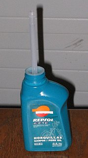 Instead of a large syringe you can use the fork oil bottle depicted below. New oil came in a bottle with a handy 11cm extension tube (BTW you need 2 small 0.5L bottles like that for two forks). That tube helps to pour the oil in. I am not sure if other brands have that feature, sorry this is my first time doing forks. This bottle can be used to suck the old oil out. Just attach some tubing to extend the hose and reach all the way into the fork. After the old oil is removed use a shorter tube to form 140mm hose (that's the distance from top of the fork recommended by Progressive). Pour in the new oil and suck the excess out with this 140mm hose. Should work just fine and save you some time.