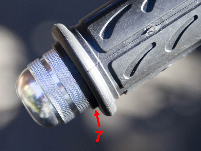 Before the right hand grip is installed you need to cut off the ridge at the end of the grip (Arrow 7). Cut it with the scalpel so that the end of the grip all sits flush. The reason for this is that the grip will be too long for the plastic throttle tube and therefore it will bind against the bar end - and your throttle wont spring back to idle. The trimmed end is shown below.