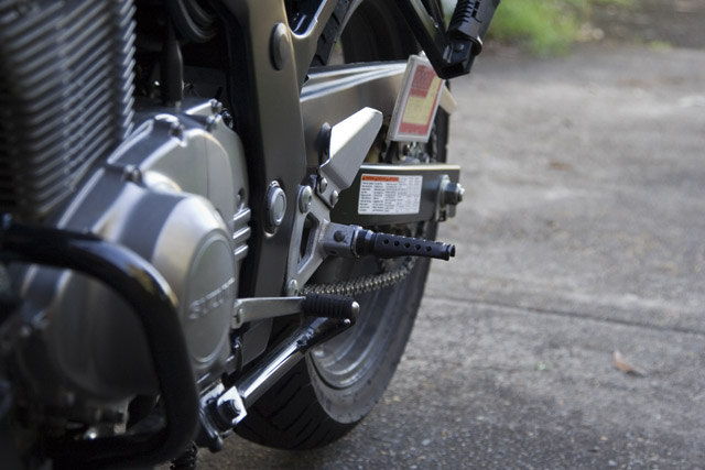 The stock pegs that come with the GS500 are chunky, heavy, and utilitarian (not sporty). This setup can be improved/lightened considerably by purchasing aftermarket rearsets or modifying another bike's to fit.